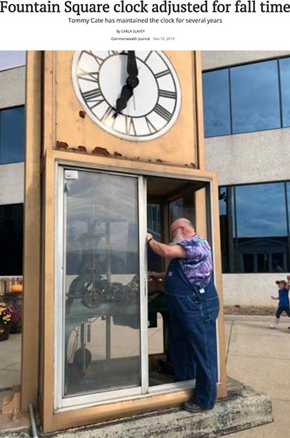 Tommy Cate, local geologist, adjusts the clock on the Fountain Square. The historic clock has to have its time changed by advancing the time forward, which can take time during the 'fall back' of changing from daylight saving to standard time. On Monday afternoon, a little bit more than a week after the end of daylight saving time, Tommy Cate was out on the edge of the Fountain Square adjusting the time on the old clock that sits in the northeast corner. He has to advance the hands hour-by-hour, he explained, because they can only move forward, not backwards. "It's real easy when you 'spring forward,'" he laughed. 'Falling back' means the downtown area was graced with the sound of the clock's bell for several minutes, every few seconds, as Cate moved the hands forward bit by bit.